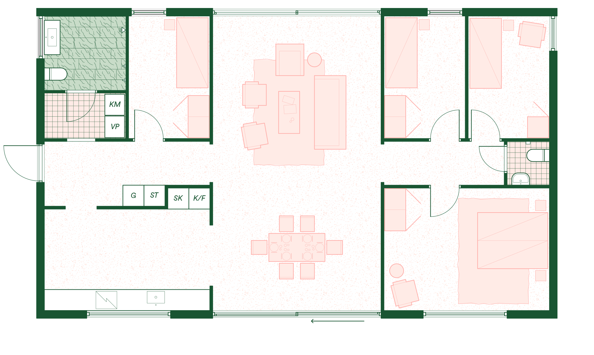 Huset med det rymliga allrummet förenar sömlöst inne och ute. Med ljusa, öppna ytor som vetter mot alla väderstreck skapas en harmonisk helhet som knyter huset till sin omgivning.