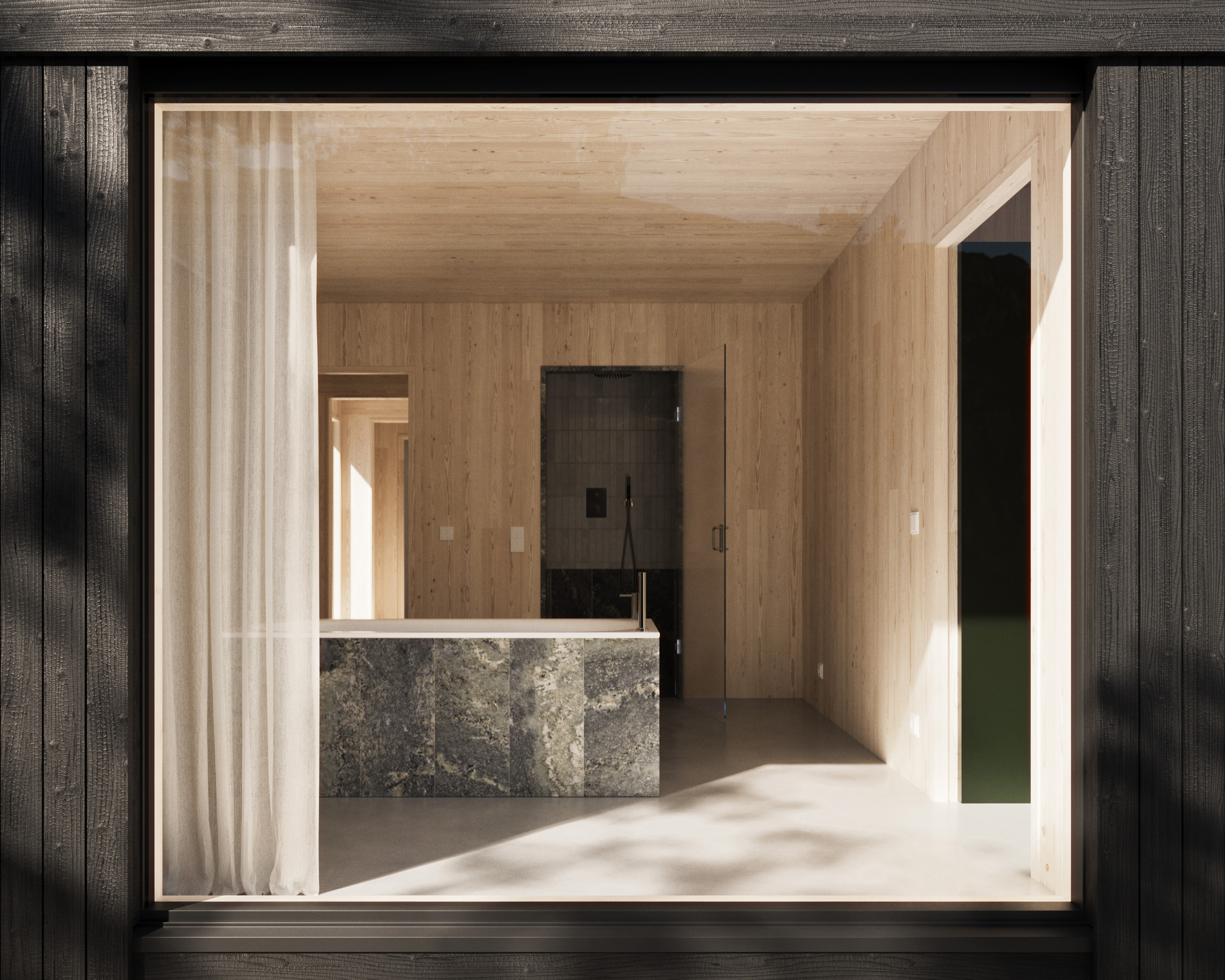 Husens fasad är behandlad med den japanska tekniken Yakisugi, där den synliga ytan bränns och förkolnas vilket förhindrar angrepp av fukt och skadedjud, utan kemiska substanser och som i princip är underhållsfri.