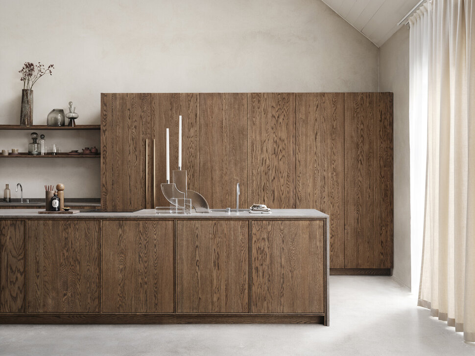 Köksmodellen Wood har frontluckor i massiv ek och är mörkbetsad. Bänkskivan och/eller köksö är slipat, rostfritt stål.